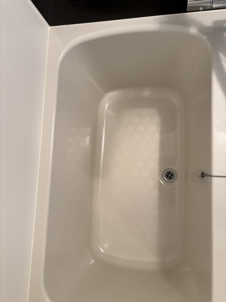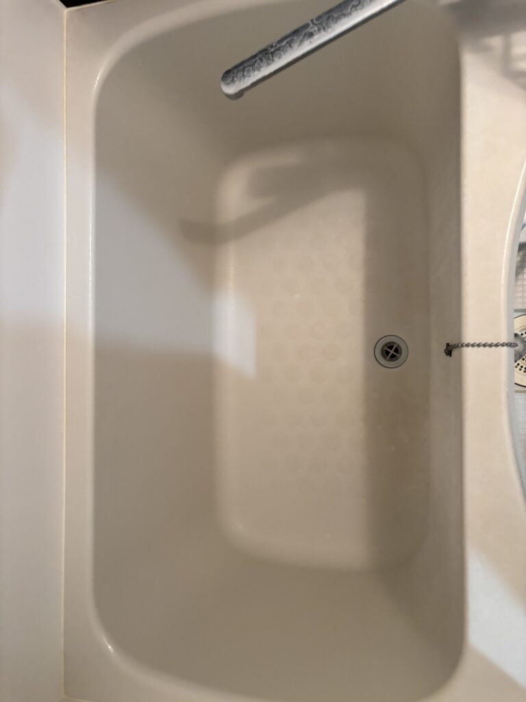 写真だとわかりずらいですが、浴槽内も石鹸カスや水垢があります。